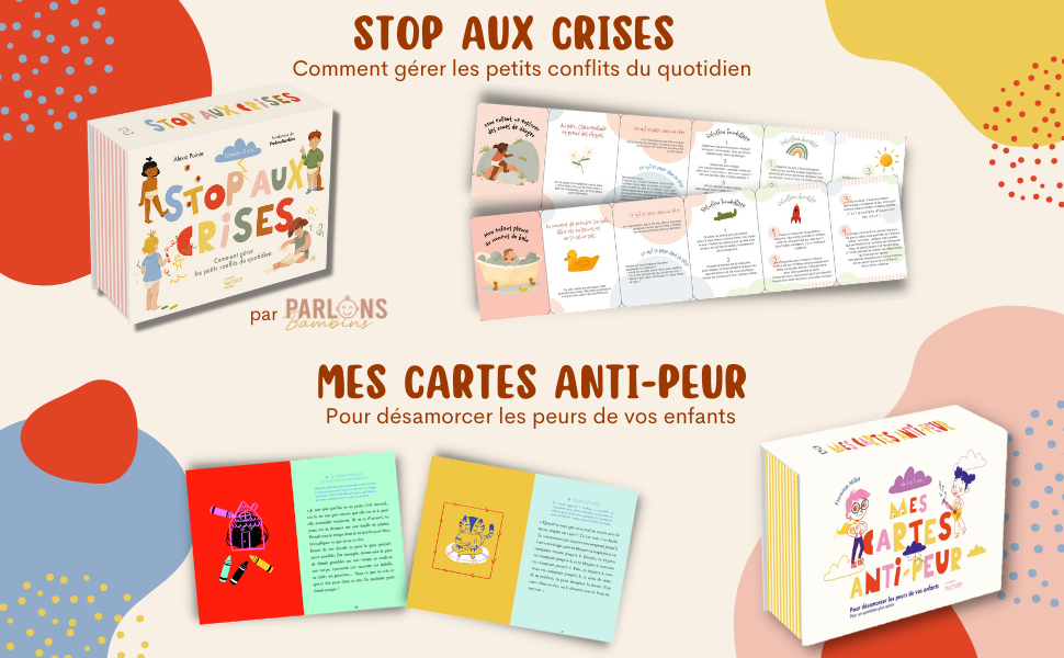 - 14 cartes illustrant chacune une situation de conflit que vous pouvez être amené à vivre au quotidien : mon enfant va explorer des zones de danger, mon enfant déchire les pages d'un livre, mon enfant ne veut pas se séparer de moi...